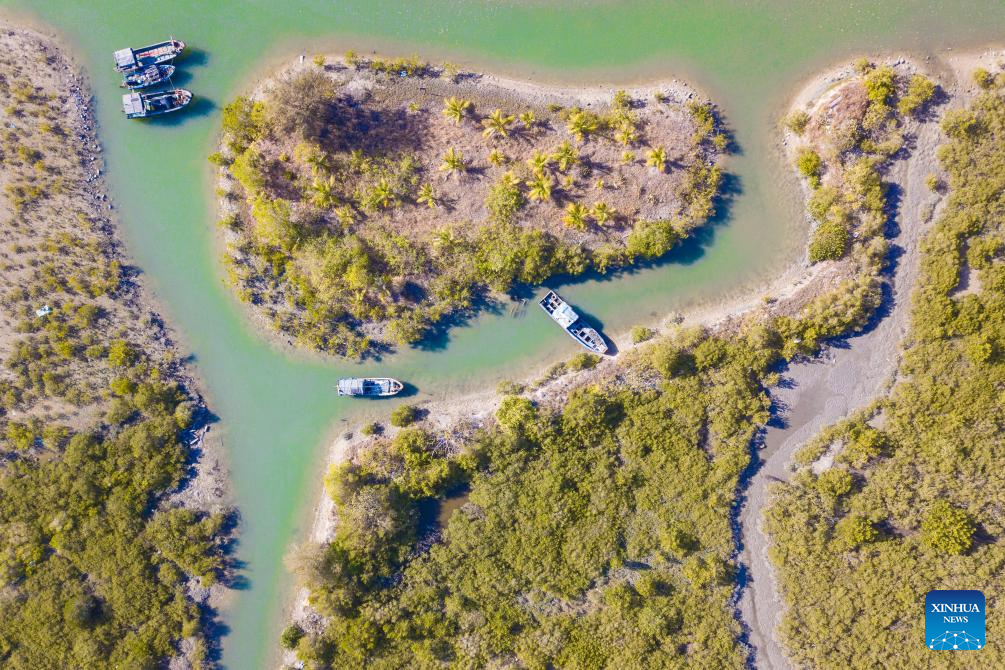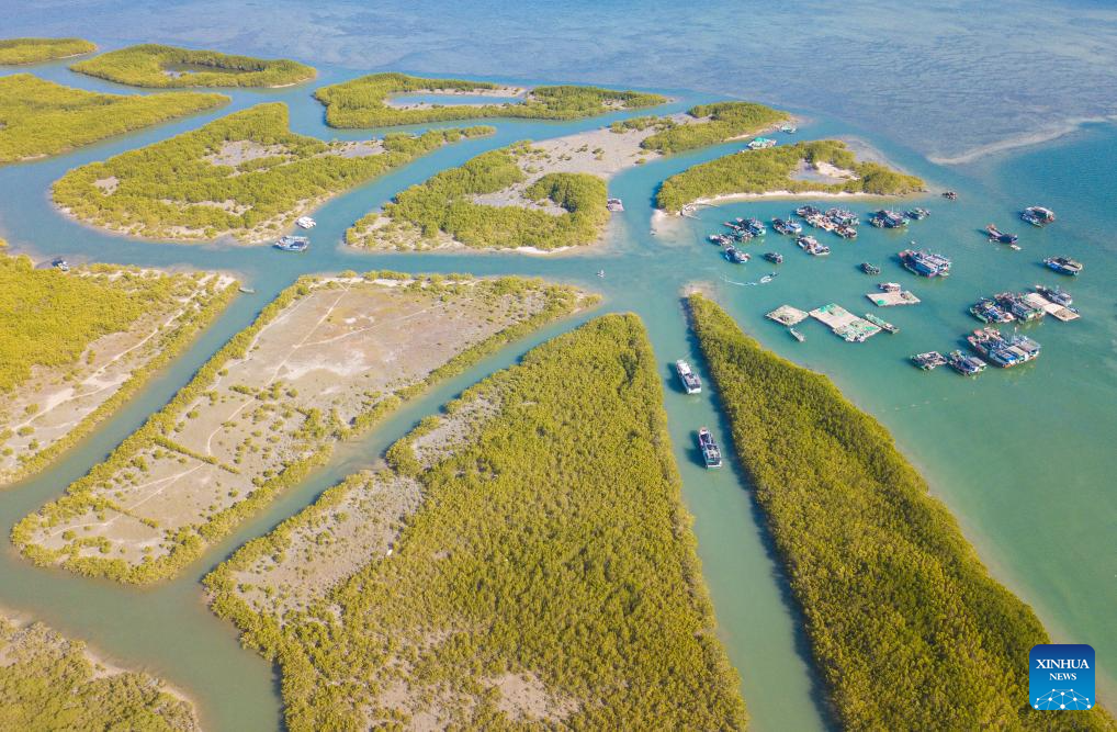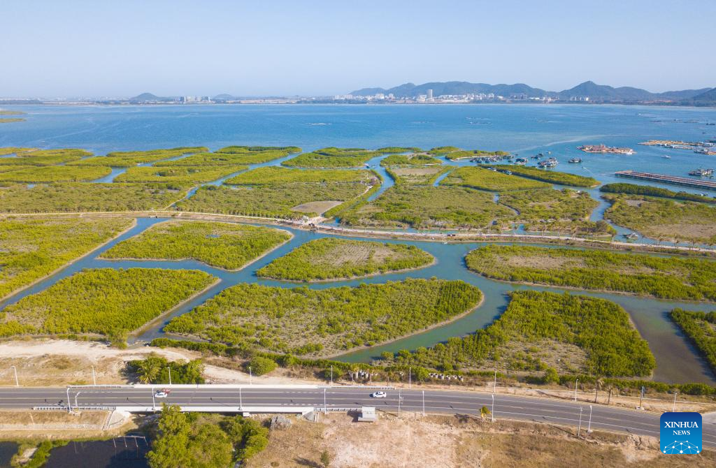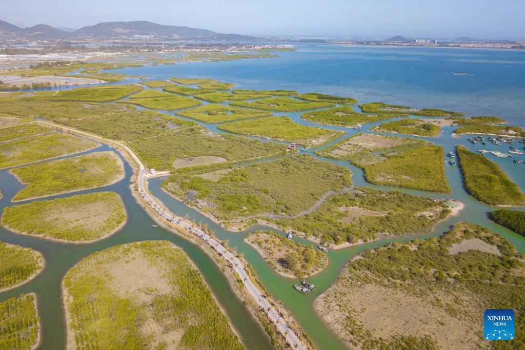 This aerial photo taken on Jan. 31, 2025 shows a view of the Hainan Lingshui Mangrove National Wetland Park in south China's Hainan Province. Home to thousands of waterfowl, the park covering 958.22 hectares has resulted from uncompromising efforts of the local authorities since 2016 to restore and protect the mangrove ecological systems. (Xinhua/Pu Xiaoxu)