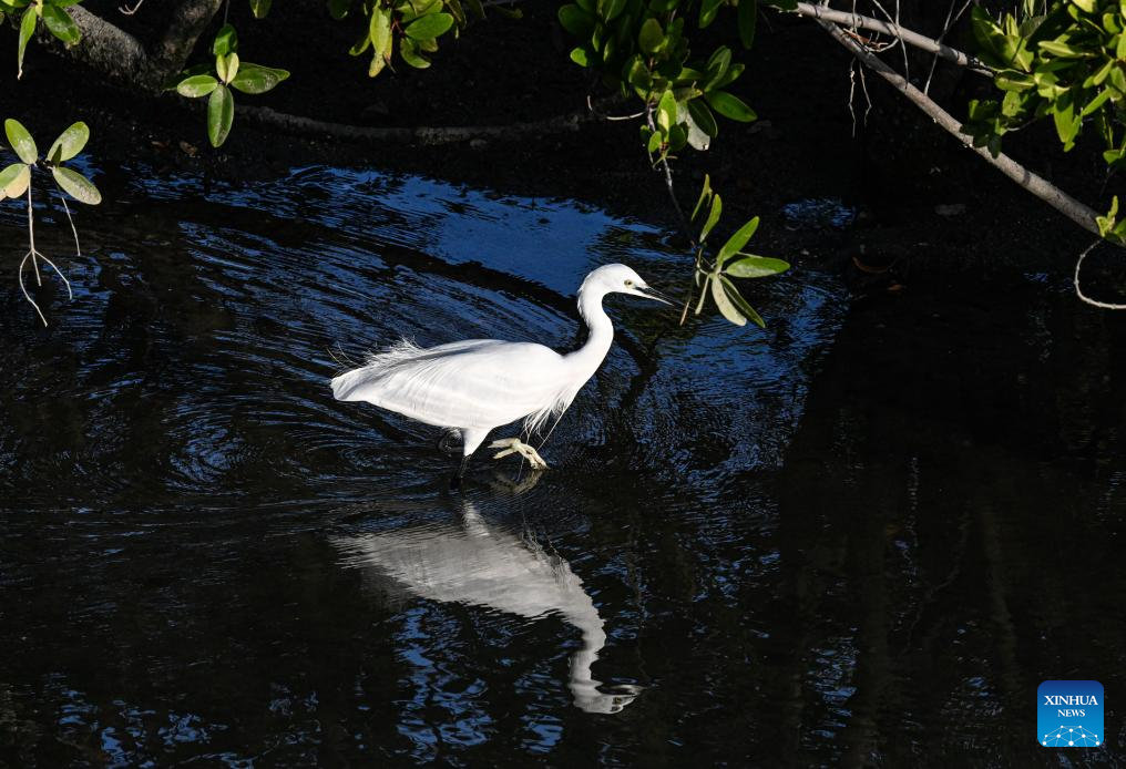 An egret forages at the Hainan Lingshui Mangrove National Wetland Park in south China's Hainan Province, Jan. 31, 2025. Home to thousands of waterfowl, the park covering 958.22 hectares has resulted from uncompromising efforts of the local authorities since 2016 to restore and protect the mangrove ecological systems. (Xinhua/Pu Xiaoxu)