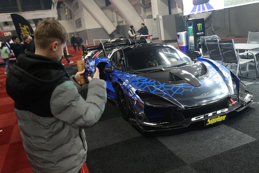 A visitor takes photos of a McLaren car displayed at Brussels Auto Show in Brussels, Belgium, Jan. 17, 2024. (Xinhua/Zhao Dingzhe)