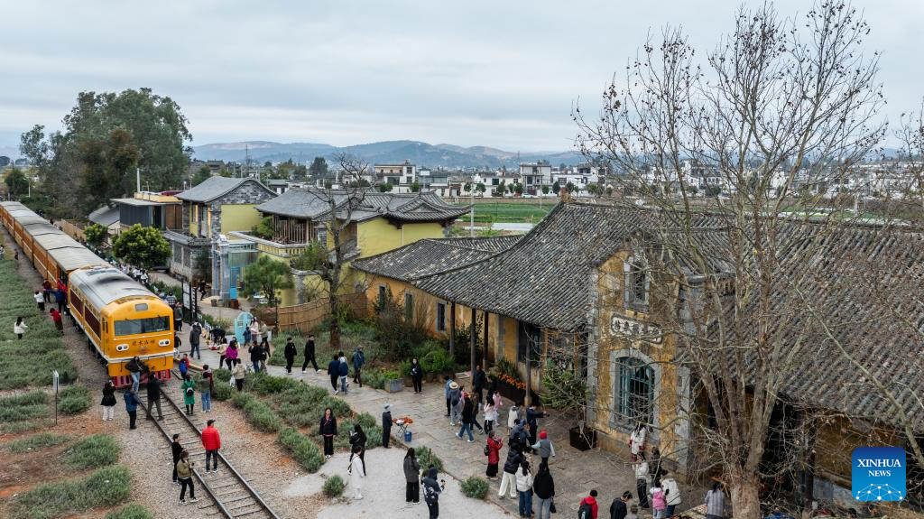 An aerial drone photo taken on Feb. 3, 2025 shows tourists visiting Xianghuiqiao station during the Spring Festival holiday at Jianshui County of the Honghe Hani and Yi Autonomous Prefecture in southwest China's Yunnan Province. (Xinhua/Hu Chao)