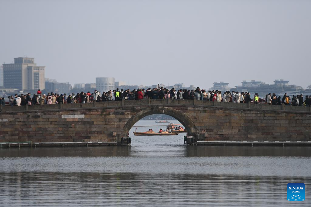 Tourists walk on the Duanqiao Bridge, or the Broken Bridge in the West Lake scenic area during the Spring Festival holiday in Hangzhou, east China's Zhejiang Province, Feb. 3, 2025. (Xinhua/Huang Zongzhi)