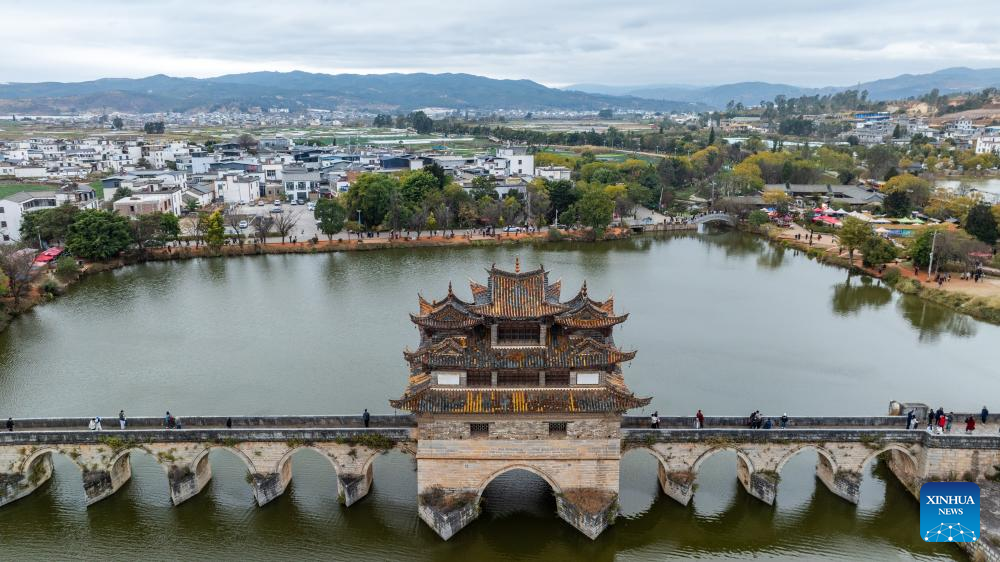 An aerial drone photo taken on Feb. 3, 2025 shows people visiting the Shuanglong bridge during the Spring Festival holiday at Jianshui County of the Honghe Hani and Yi Autonomous Prefecture in southwest China's Yunnan Province. (Xinhua/Hu Chao)