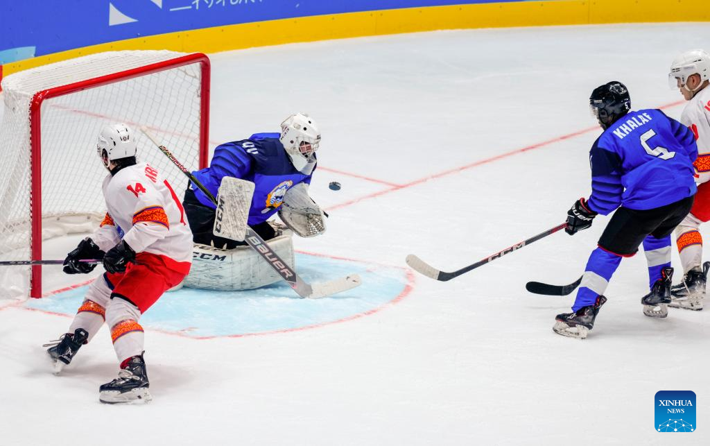 Mamed Seifulov (C) of Kyrgyzstan competes during the men's ice hocky group B match between Kuwait and Kyrgyzstan at 2025 Asian Winter Games in Harbin, northeast China's Heilongjiang Province, on Feb. 3, 2025. (Xinhua/Wang Jianwei)