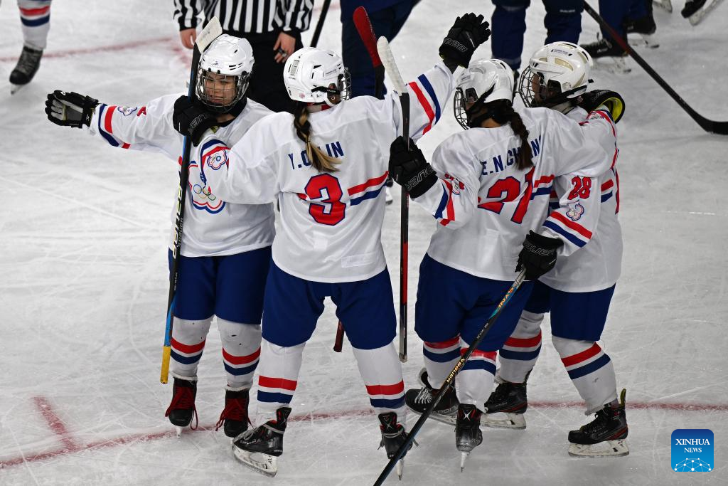 Players of Chinese Taipei celebrate scoring during the women's ice hocky group B match between Thailand and Chinese Taipei at 2025 Asian Winter Games in Harbin, northeast China's Heilongjiang Province, on Feb. 3, 2025. (Xinhua/Chen Zhenhai)