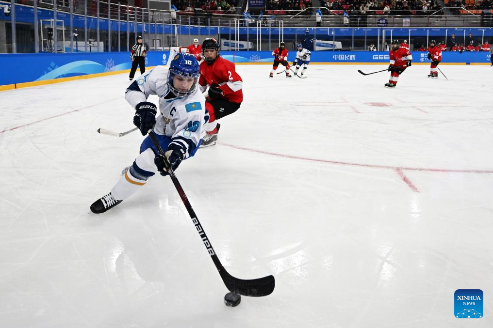 Munira Sayakhatkyzy (L) of Kazakhstan competes during the women's ice hocky group B match between Kazakhstan and China's Hong Kong at 2025 Asian Winter Games in Harbin, northeast China's Heilongjiang Province, on Feb. 3, 2025. (Xinhua/Chen Zhenhai)