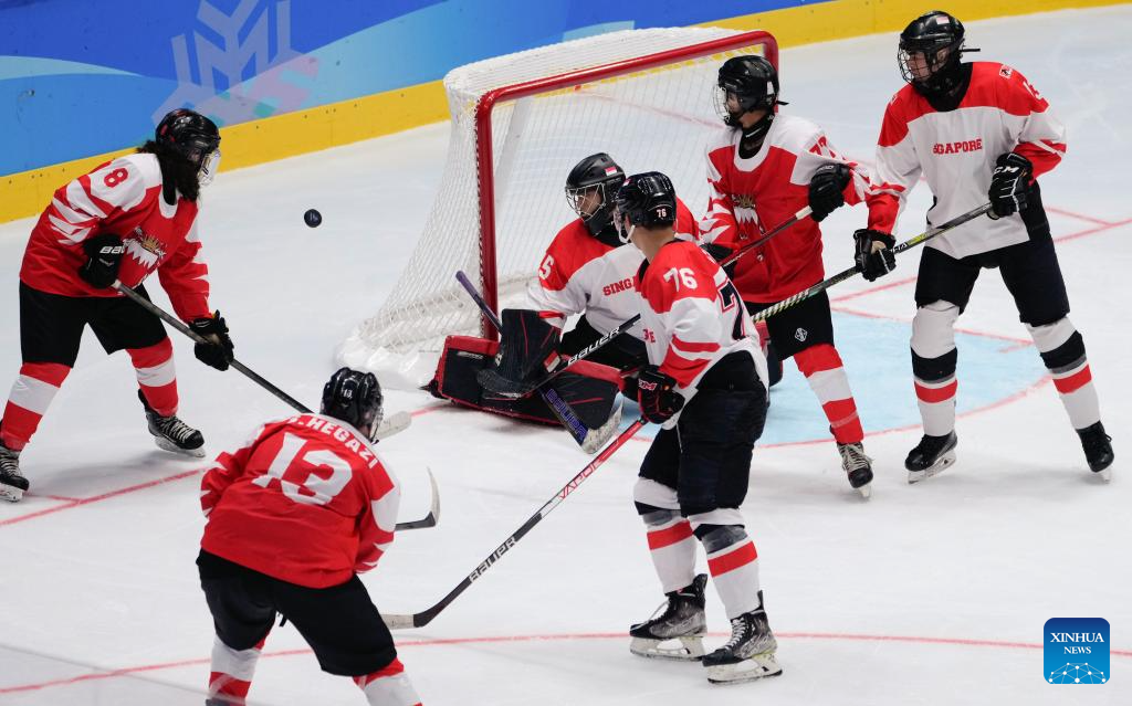 Chan Joshua Yu Wen (C) of Singapore shoots during the men's ice hocky group B match between Singapore and Bahrain at 2025 Asian Winter Games in Harbin, northeast China's Heilongjiang Province, on Feb. 3, 2025. (Xinhua/Wang Jianwei)