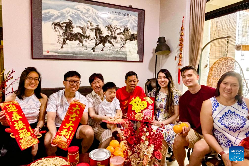 Minnie Ang (3rd R) celebrates the Spring Festival with her family members in her apartment in Singapore on Feb. 1, 2025. (Xinhua)