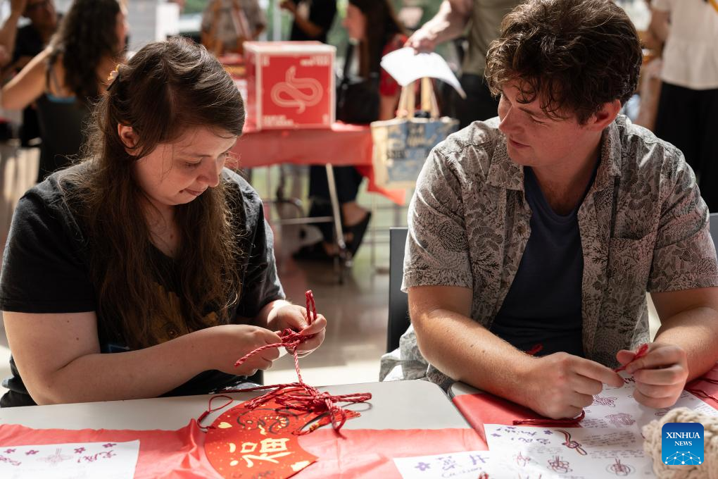 Local residents learn to make decorative Chinese knots during an event celebrating the Chinese New Year at the Auckland Art Gallery in Auckland, New Zealand, Feb. 1, 2025. (Photo by Wu Jiaxiang/Xinhua)