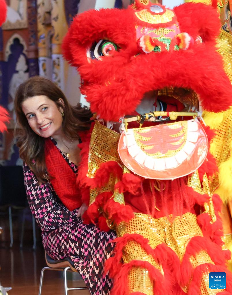 A woman interacts with a lion dancer during an event celebrating the Chinese New Year in Wellington, New Zealand, Feb. 1, 2025. (Photo by Meng Tao/Xinhua)