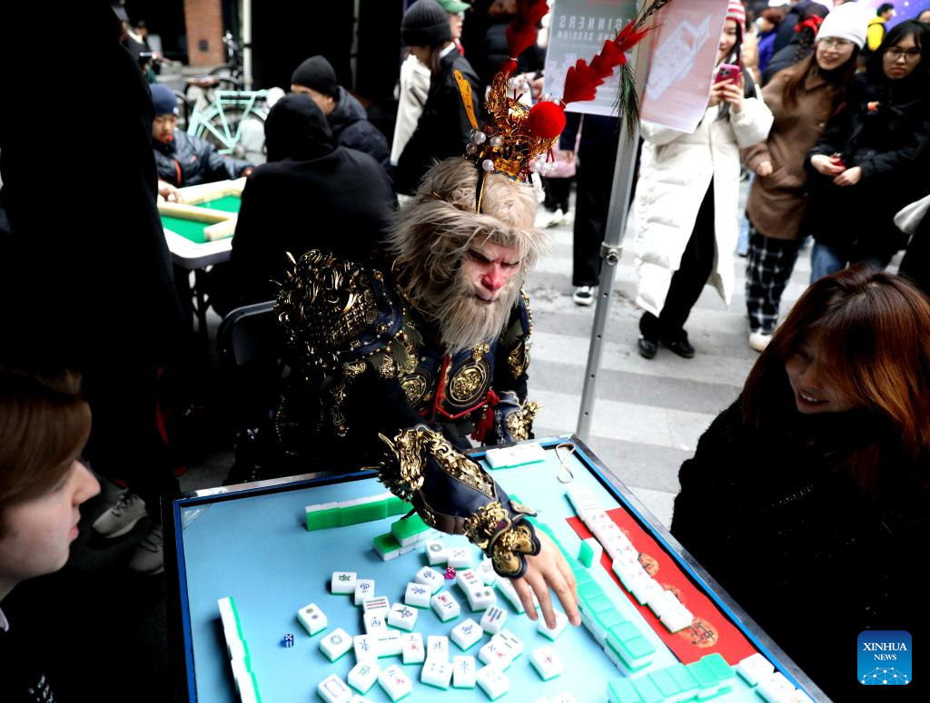 A person in Monkey King costumes plays Mahjong during a Chinese New Year celebration at Camden Market in London, Britain, Feb. 1, 2025. (Xinhua/Li Ying)