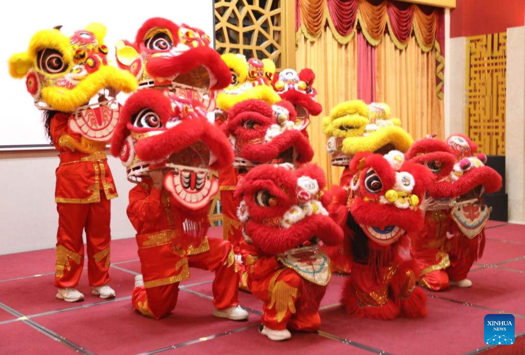 People perform lion dance during an event to mark the upcoming Chinese Lunar New Year in Hawalli Governorate, Kuwait, Jan. 23, 2025. The event was hosted by the Chinese embassy in Kuwait on Thursday evening. (Photo by Hu Tiancan/Xinhua)