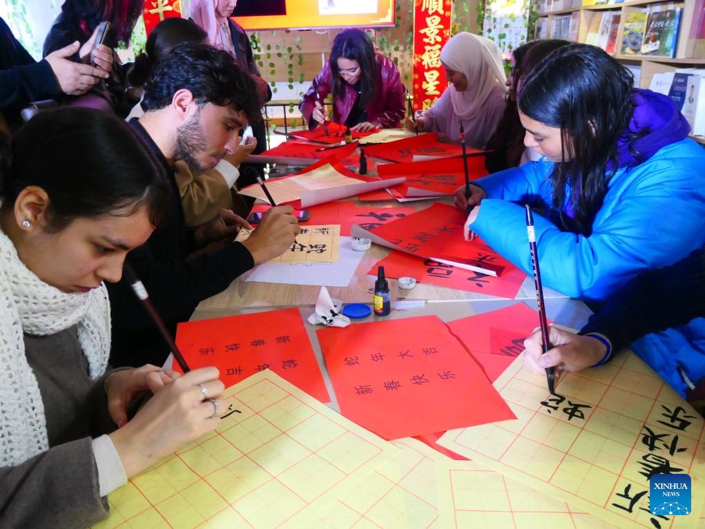 Tunisian Chinese learners practice Chinese calligraphy during a cultural event held at a bookstore in celebration of the Chinese New Year, also known as the Spring Festival, in Tunis, Tunisia, Feb. 1, 2025. (Xinhua/Huang Ling)