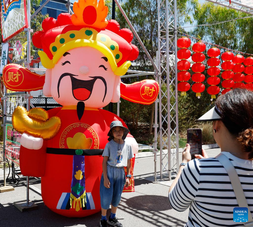 A tourist poses for a photo with a mascot during a celebration of the Chinese New Year in Melbourne, Australia, Feb. 1, 2025. (Xinhua/Ma Ping)