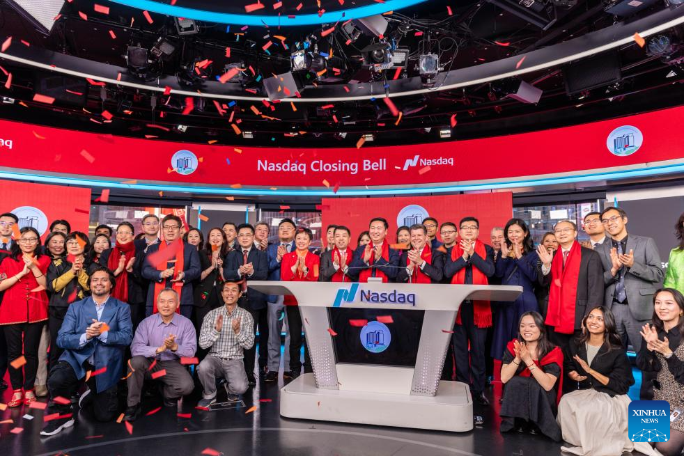 Guests take part in a closing bell ceremony held by Nasdaq and the Chinese Consulate General in New York in celebration of the Chinese Lunar New Year, in New York, the United States, Jan. 27, 2025.(Photo by Winston Zhou/Xinhua)