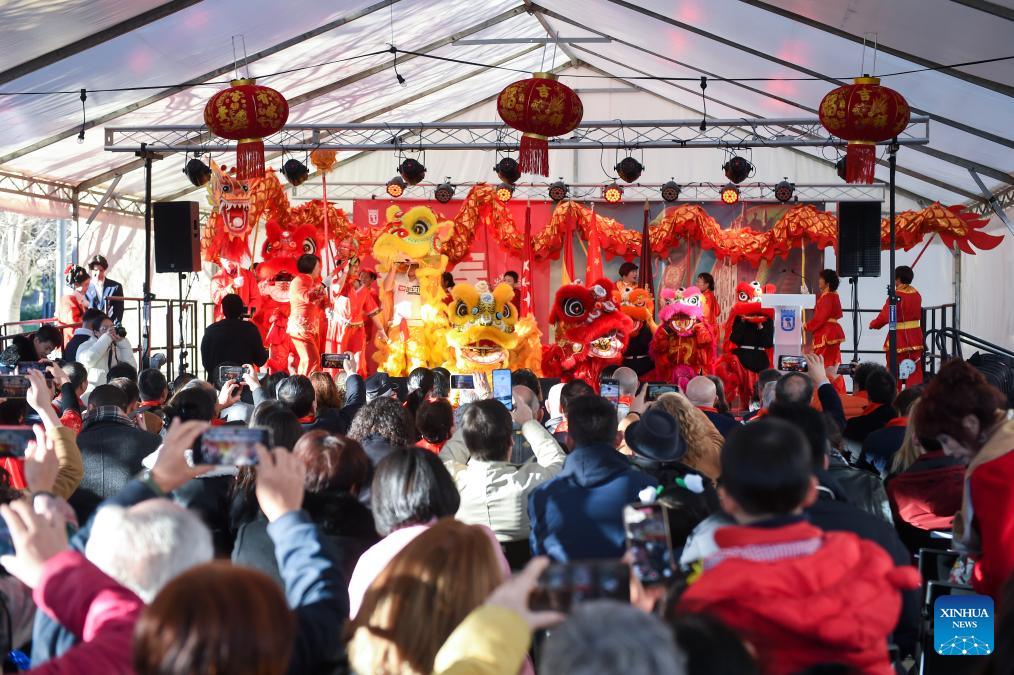 People watch a performance during a celebration of the Chinese New Year in Madrid, Spain, Jan. 31, 2025. (Photo by Gustavo Valiente/Xinhua)