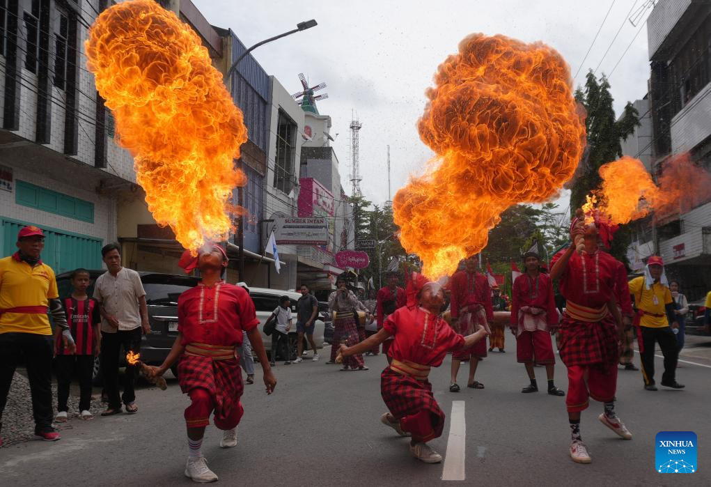 People perform Pepe-Pepeka ri Makka dance in a cultural event in celebration of the Chinese Lunar New Year, or the Spring Festival, in Makassar, South Sulawesi Province, Indonesia, Feb. 2, 2025. (Photo by Masyudi Firmansyah/Xinhua)