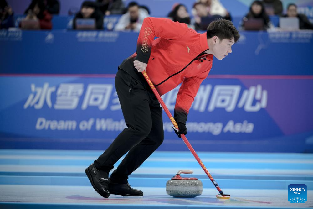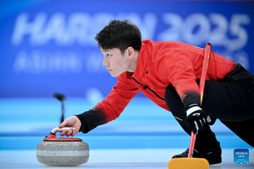 Wang Zhiyu of China competes during the mixed doubles Round Robin Session 1 match between Amina Seitzhanova/Azizbek Nadirbayev of Kazakhstan and Han Yu/Wang Zhiyu of China in the curling event at 2025 Asian Winter Games in Harbin, northeast China's Heilongjiang Province, Feb. 4, 2025. (Xinhua/Jiang Han)