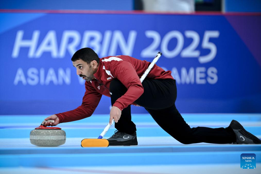 Nasser Abdulrahman Alyafei of Qatar competes during the mixed doubles Round Robin Session 1 match between Mabarka Al-Abdulla/Nasser Abdulrahman Alyafei of Qatar and Keremet Asanbaeva/Iskhak Abykeev of Kyrgyzstan in the curling event at 2025 Asian Winter Games in Harbin, northeast China's Heilongjiang Province, Feb. 4, 2025. (Xinhua/Jiang Han)