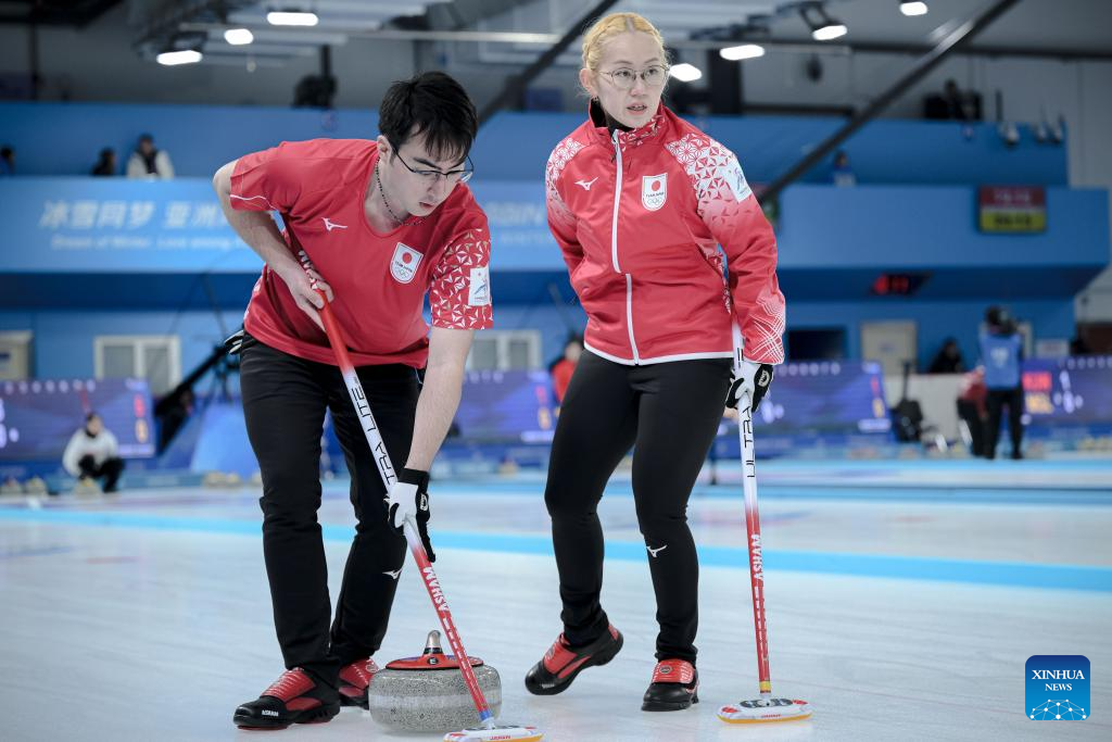 Koana Tori (L)/Aoki Go of Japan compete during the mixed doubles Round Robin Session 1 match against Chanatip Sonkham/Teekawin Jearateerawit of Thailand in the curling event at 2025 Asian Winter Games in Harbin, northeast China's Heilongjiang Province, Feb. 4, 2025. (Xinhua/Jiang Han)