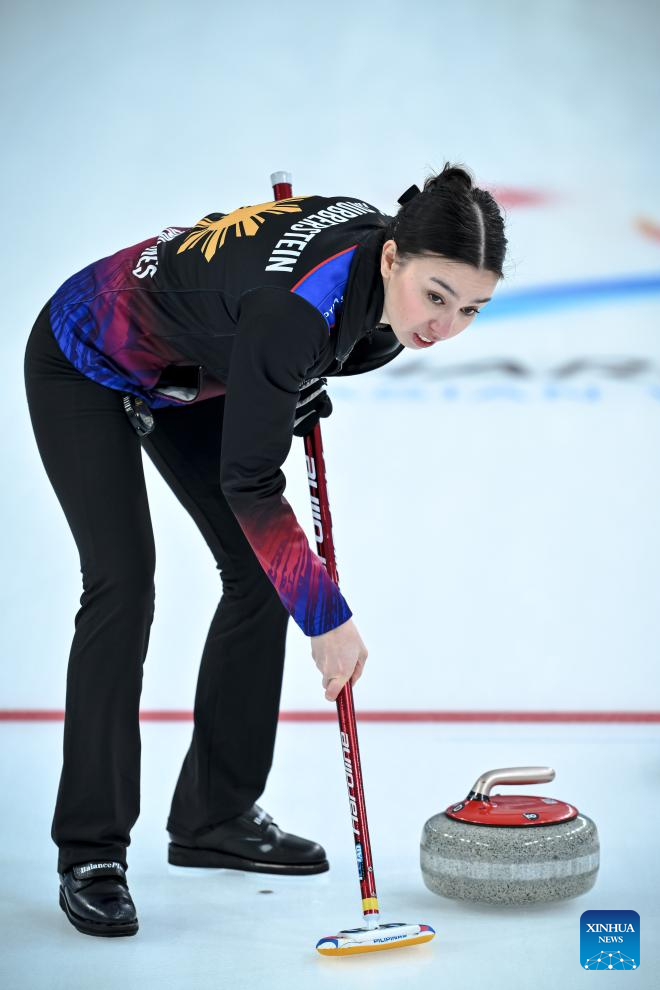 Kathleen Sumbillo Dubberstein of the Phillipines competes during the mixed doubles Round Robin Session 1 match between Kathleen Sumbillo Dubberstein/Marc Pfister of the Phillipines and Kim Kyeongae/Seong Jihoon of South Korea in the curling event at 2025 Asian Winter Games in Harbin, northeast China's Heilongjiang Province, Feb. 4, 2025. (Xinhua/Jiang Han)