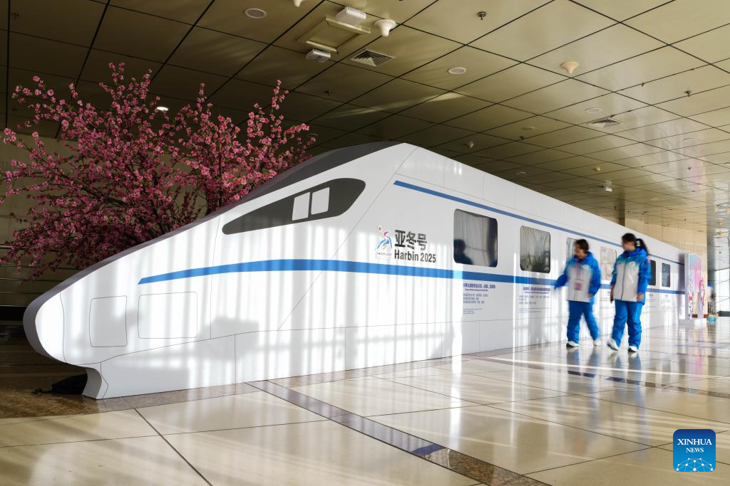 Volunteers pass an installation for the 2025 Asian Winter Games at the main press center in the Main Media Center (MMC) in Harbin, northeast China's Heilongjiang Province, Feb. 5, 2025. (Xinhua/Zheng Huansong)