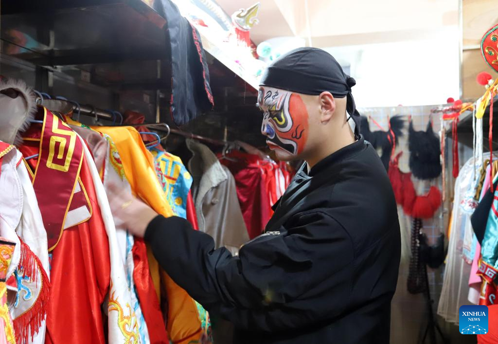 A Yingge dance team member prepares for performance at a training base in Shantou, south China's Guangdong Province, Jan. 29, 2025. (Photo by Yao Jun/Xinhua)
