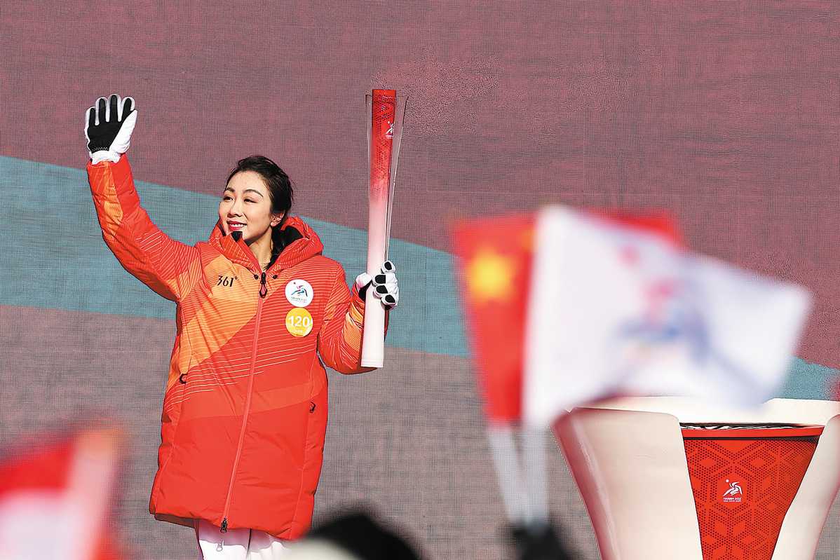 Beijing 2022 gold medalist figure skater Sui Wenjing during the torch relay in Harbin on Feb 3. (Photo/Xinhua)