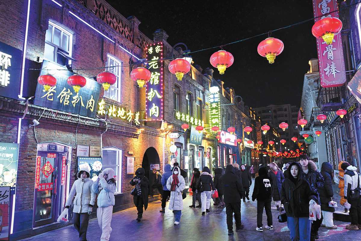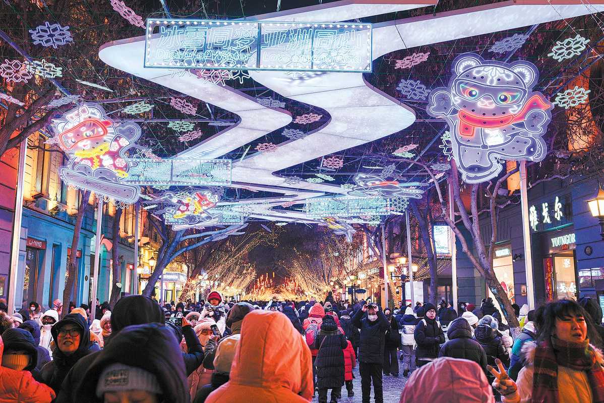 Crowds enjoy the dazzling light shows and nighttime atmosphere of Harbin, as visitors flock to the Heilongjiang provincial capital to experience its winter charm. (Photo/Xinhua)