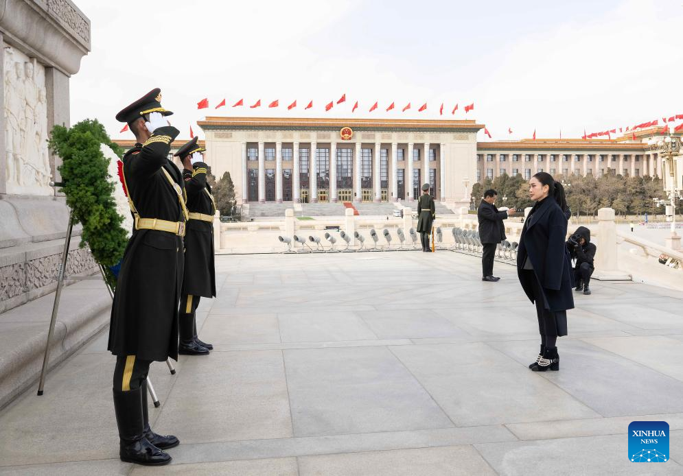 Thai Prime Minister Paetongtarn Shinawatra lays a wreath at the Monument to the People's Heroes on Tian'anmen Square in Beijing, capital of China, Feb. 6, 2025. (Xinhua/Li Tao)