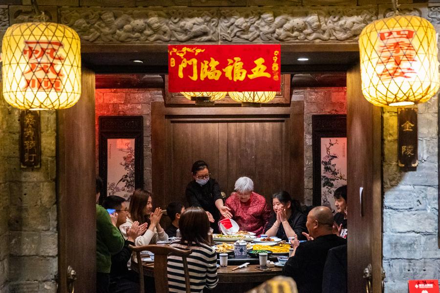 People have a reunion meal at a restaurant in Nanjing City, east China's Jiangsu Province, Jan. 28, 2025. (Photo by Zhang Meng/Xinhua)