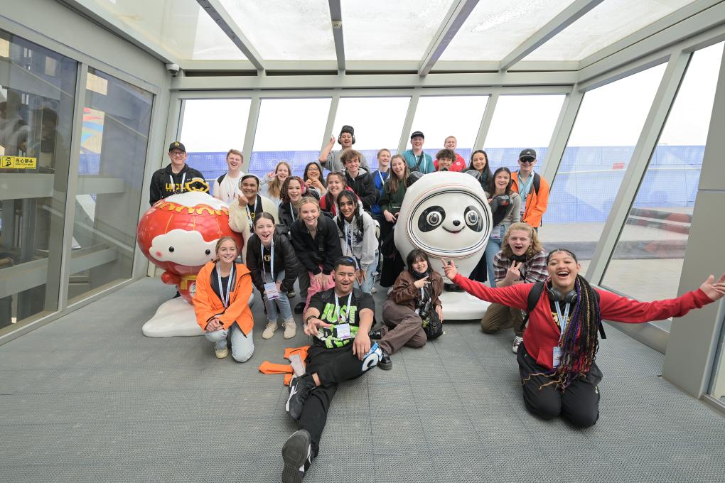 Members of a delegation of high school students from the U.S. state of Washington pose for a photo with Bing Dwen Dwen, mascot of the Beijing 2022 Olympic Winter Games, and Shuey Rhon Rhon, mascot of the Beijing 2022 Paralympic Winter Games, at Big Air Shougang in Beijing, capital of China, March 21, 2024. (Xinhua/Li Xin)