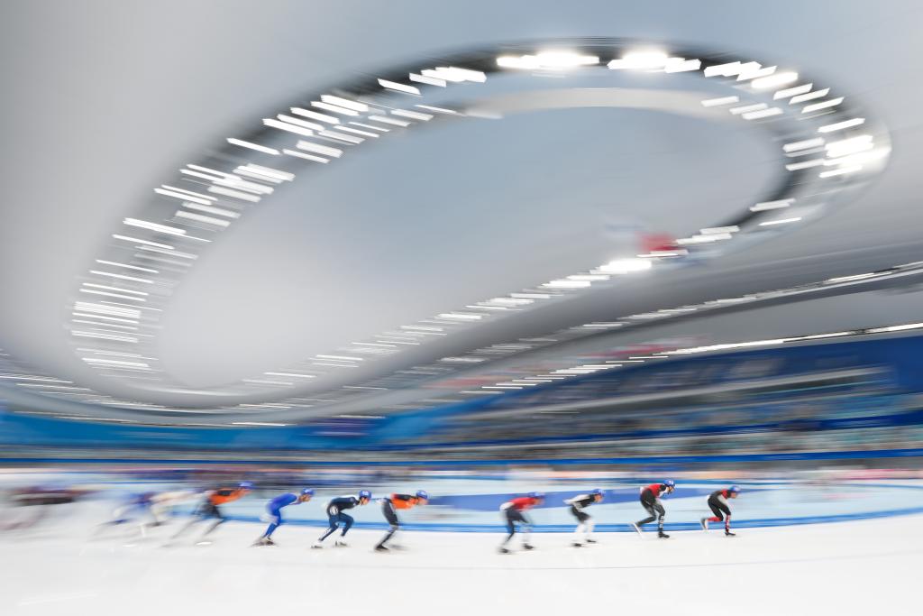 Athletes compete during the mass start men Division A race at the ISU World Cup Speed Skating in Beijing, capital of China, on Dec. 1, 2024. (Xinhua/Ju Huanzong)