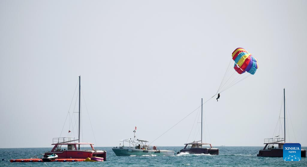 Tourists have fun at the Dadonghai scenic area in Sanya, south China's Hainan Province, Feb. 6, 2025. Sanya received over 2.56 million tourists during the 8-day Spring Festival holiday, generating 6.7 billion yuan (about 920 million U.S. dollars) in tourism revenue. (Xinhua/Zhao Yingquan)