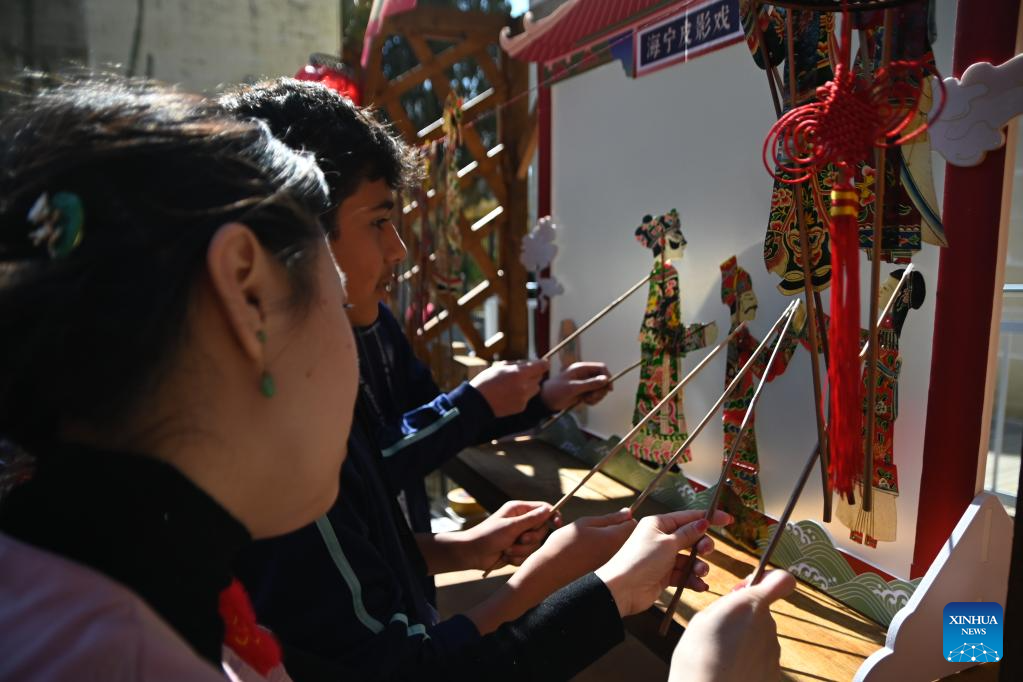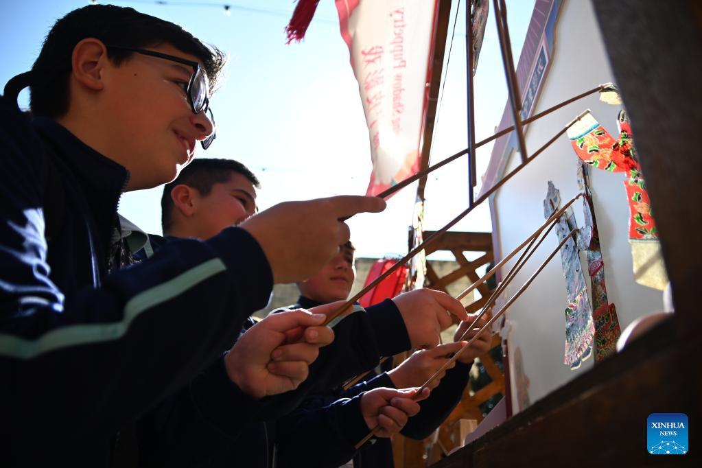 Students try to perform shadow play during the Chinese Spring Festival temple fair in Zejtun, Malta, on Feb. 6, 2025. The campus of St. Thomas More College's middle and secondary school in Zejtun, southeastern Malta, came alive with festive cheer on Thursday as students experienced the vibrant atmosphere of a traditional Chinese Spring Festival temple fair. Co-organized by the China Cultural Center in Malta and the Zhejiang Provincial Cultural Center, the event attracted over 500 students and teachers. (Photo by Jonathan Borg/Xinhua)