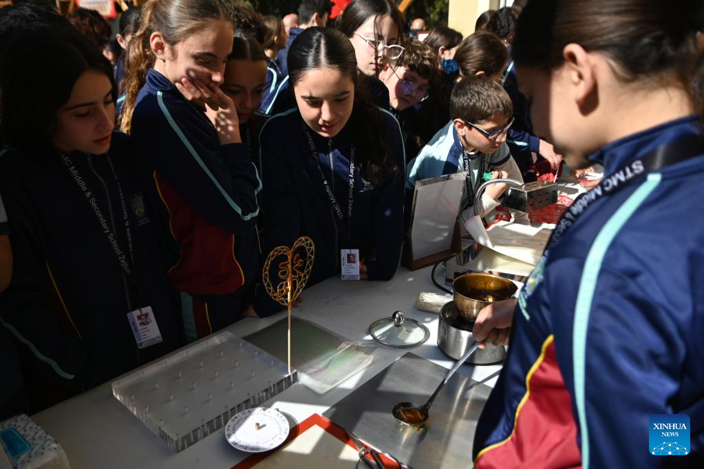 Students try to create sugar figurines during the Chinese Spring Festival temple fair in Zejtun, Malta, on Feb. 6, 2025. The campus of St. Thomas More College's middle and secondary school in Zejtun, southeastern Malta, came alive with festive cheer on Thursday as students experienced the vibrant atmosphere of a traditional Chinese Spring Festival temple fair. Co-organized by the China Cultural Center in Malta and the Zhejiang Provincial Cultural Center, the event attracted over 500 students and teachers. (Photo by Jonathan Borg/Xinhua)