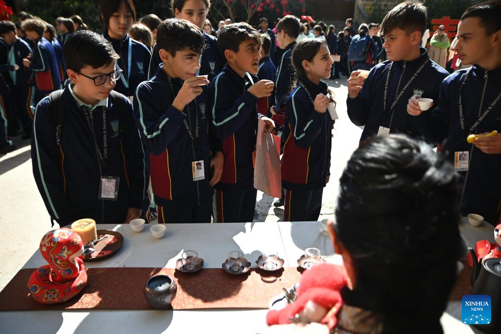 Students taste Chinese tea during the Chinese Spring Festival temple fair in Zejtun, Malta, on Feb. 6, 2025. The campus of St. Thomas More College's middle and secondary school in Zejtun, southeastern Malta, came alive with festive cheer on Thursday as students experienced the vibrant atmosphere of a traditional Chinese Spring Festival temple fair. Co-organized by the China Cultural Center in Malta and the Zhejiang Provincial Cultural Center, the event attracted over 500 students and teachers. (Photo by Jonathan Borg/Xinhua)