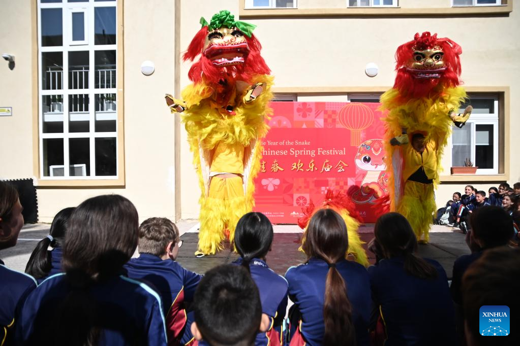 Students watch a lion dance performance during the Chinese Spring Festival temple fair in Zejtun, Malta, on Feb. 6, 2025. The campus of St. Thomas More College's middle and secondary school in Zejtun, southeastern Malta, came alive with festive cheer on Thursday as students experienced the vibrant atmosphere of a traditional Chinese Spring Festival temple fair. Co-organized by the China Cultural Center in Malta and the Zhejiang Provincial Cultural Center, the event attracted over 500 students and teachers. (Photo by Jonathan Borg/Xinhua)