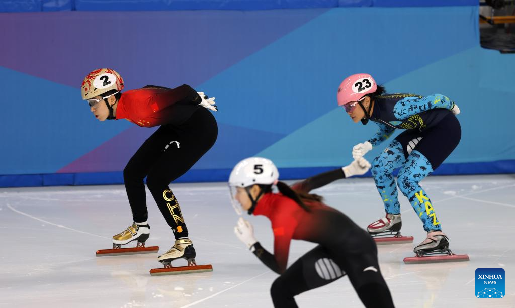 Fan Kexin (C) of China competes during the mixed 2000m relay semifinal match of the short track speed skating event at the 9th Asian Winter Games in Harbin, northeast China's Heilongjiang Province, Feb. 7, 2025. (Xinhua/Sun Fei)
