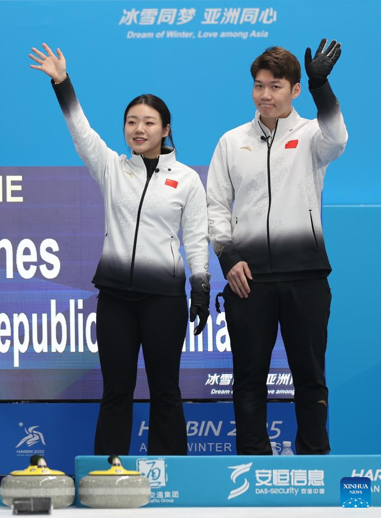 Han Yu (L) and Wang Zhiyu of China greet the audience before the mixed doubles bronze medal match of the curling event between Han Yu/Wang Zhiyu of China and Kathleen Sumbillo Dubberstein/Marc Pfister of the Philippines at the 9th Asian Winter Games in Harbin, northeast China's Heilongjiang Province, Feb. 8, 2025. (Xinhua/Hu Xingyu)