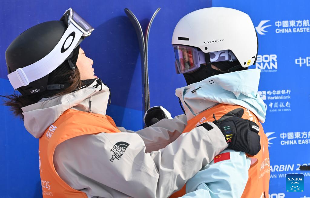 Li Fanghui (R) of China celebrates with Zhang Kexin of China after the women's Freeski Halfpipe final match of the Freestyle Skiing event at the 9th Asian Winter Games in Yabuli, northeast China's Heilongjiang Province, Feb. 8, 2025. Li Fanghui claimed China's first gold medal of the Games here on Saturday. (Xinhua/Yang Chenguang)
