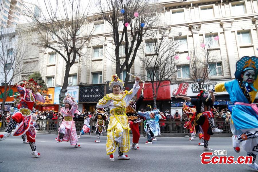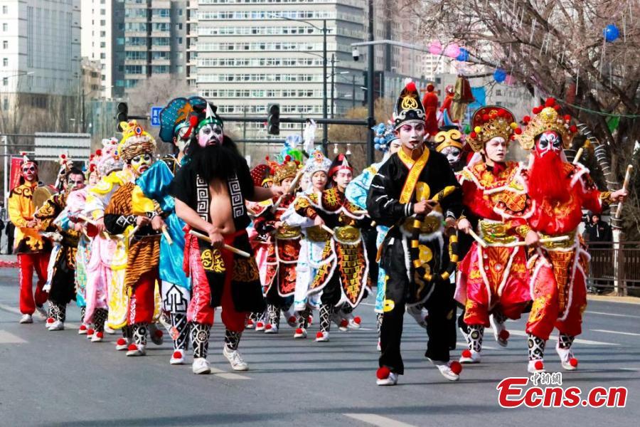 Dancers perform the Chaoshan Yingge dance, or "dance to the hero's song," in Xining, northwest China's Qinghai Province. (China News Service/Ma Mingyan)