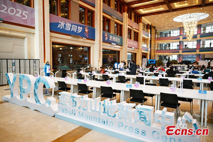 Journalists work at the media center for the 9th Asian Winter Games at Yabuli Ski Resort, northeast China's Heilongjiang Province, Feb. 7, 2025. (China News Service/Liu Wenhua)