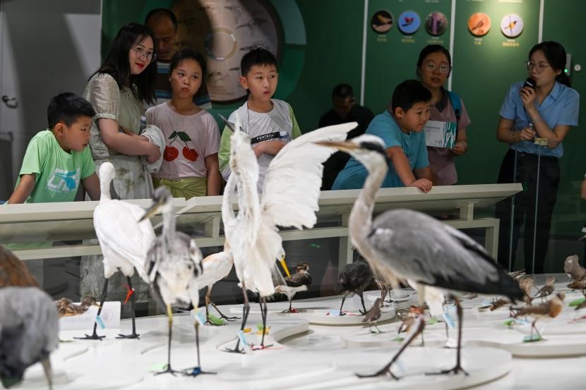 Tourists watch specimens of birds at the Yellow Sea Wetland Museum in Yancheng, east China's Jiangsu province, July 21, 2024. (People's Daily Online/Fang Dongxu)