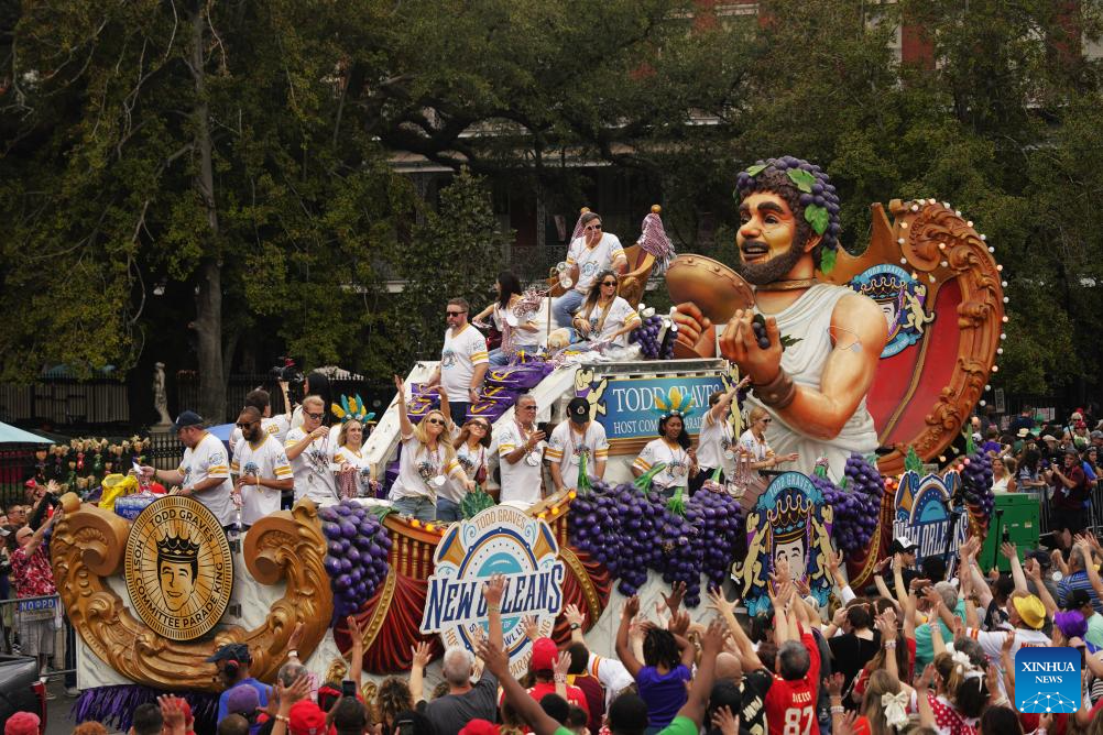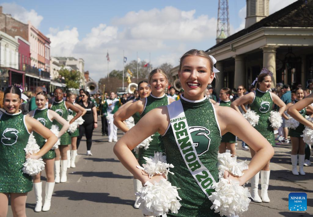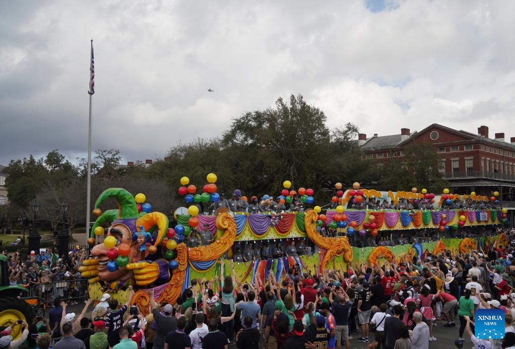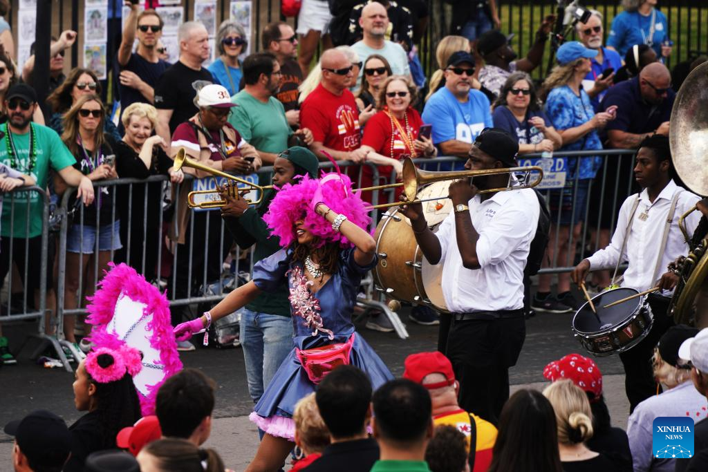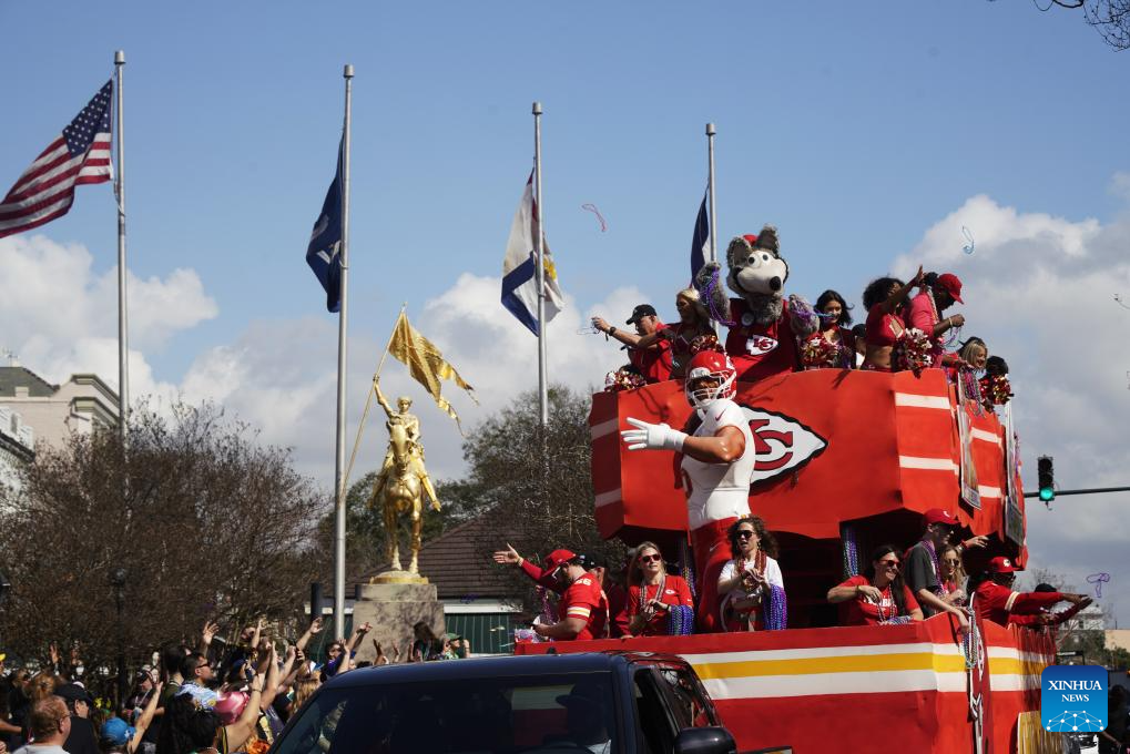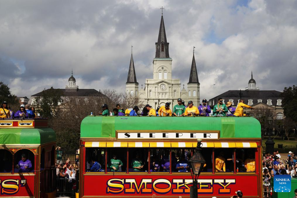 People attend the Super Bowl parade in the Historic French Quarter and Downtown New Orleans, the United States, on Feb. 8, 2025. (Xinhua/Wu Xiaoling)