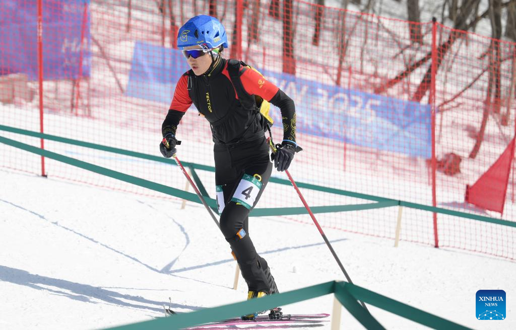 Ji Lulu of China competes during the Ski Mountaineering women's sprint qaulification match at the 9th Asian Winter Games in Yabuli, northeast China's Heilongjiang Province, Feb. 9, 2025. (Xinhua/Mu Yu)