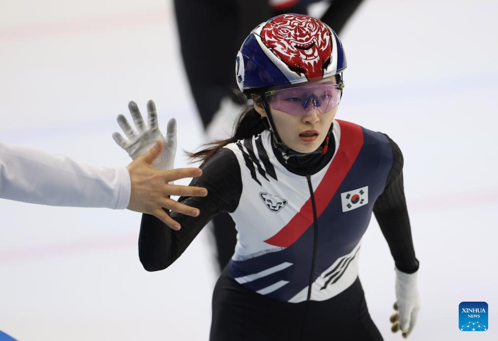 Choi Minjeong of South Korea reacts after the women's 1000m final match of the short track speed skating event at the 9th Asian Winter Games in Harbin, northeast China's Heilongjiang Province, Feb. 9, 2025. (Xinhua/Zhang Tao)