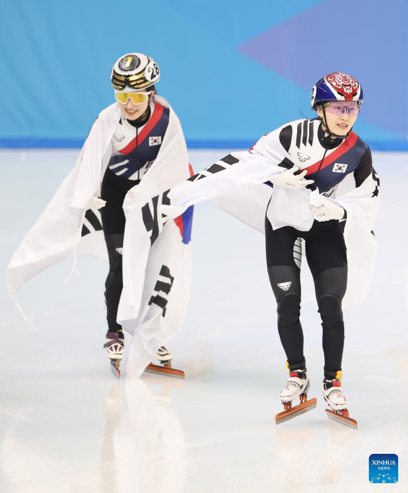 Choi Minjeong (L) and Kim Gilli of South Korea celebrate after the women's 1000m final match of the short track speed skating event at the 9th Asian Winter Games in Harbin, northeast China's Heilongjiang Province, Feb. 9, 2025. (Xinhua/Xu Yanan)