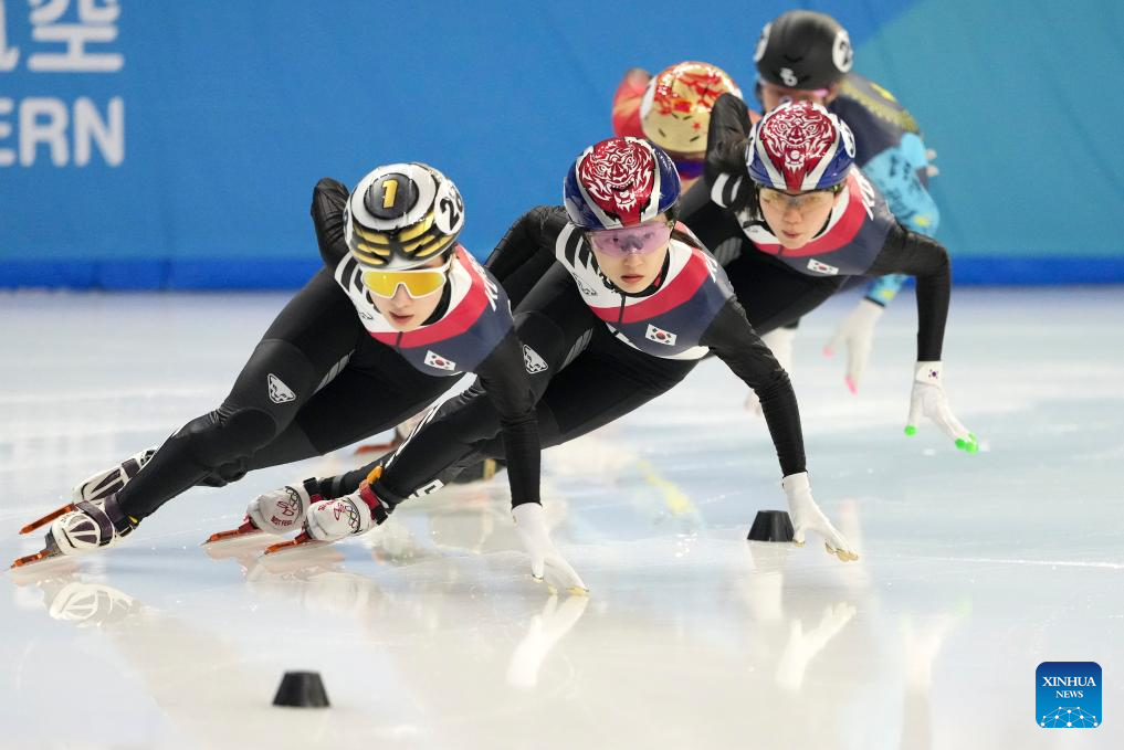 Kim Gilli (L, front), Choi Minjeong (C, front) and Shim Sukhee (R, front) of South Korea compete during the women's 1000m final match of the short track speed skating event at the 9th Asian Winter Games in Harbin, northeast China's Heilongjiang Province, Feb. 9, 2025. (Xinhua/Yan Linyun)