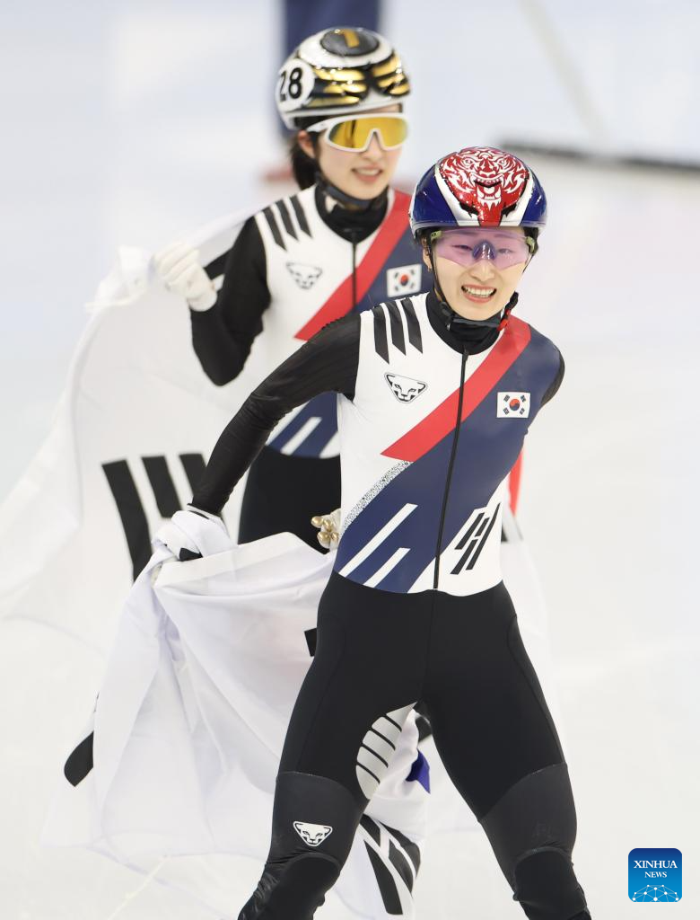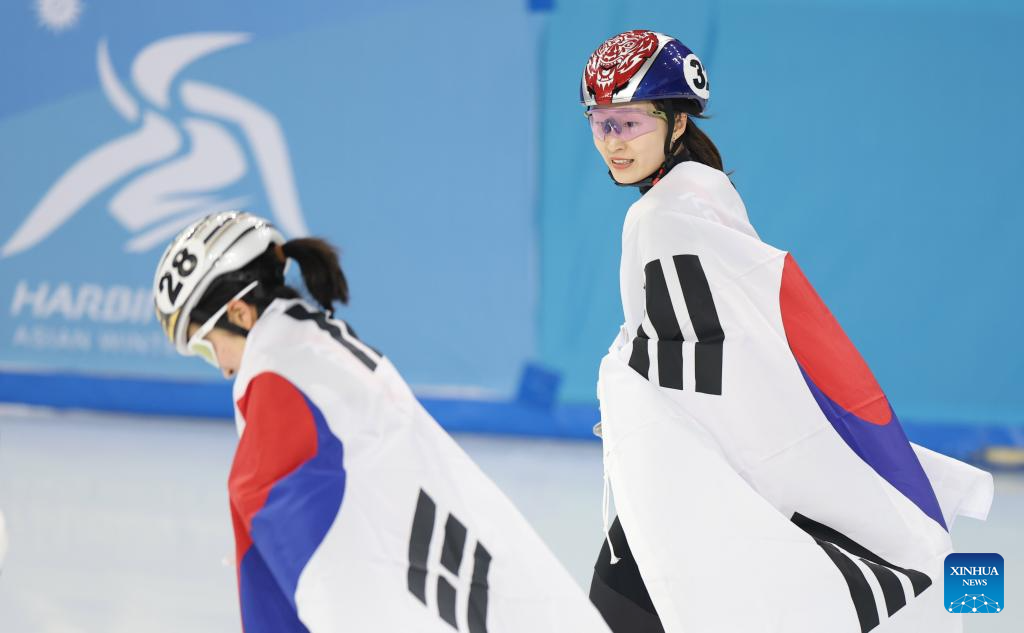 Choi Minjeong (L) of South Korea celebrates after the women's 1000m final match of the short track speed skating event at the 9th Asian Winter Games in Harbin, northeast China's Heilongjiang Province, Feb. 9, 2025. (Xinhua/Jiang Han)