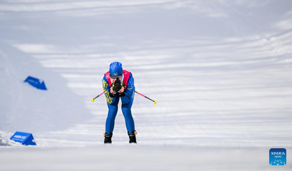 Darya Ryazhko of Kazakhstan competes during the women's sprint classic qualification match of the cross-country skiing event at the 9th Asian Winter Games in Yabuli, northeast China's Heilongjiang Province, Feb. 8, 2025. (Xinhua/Lian Zhen)